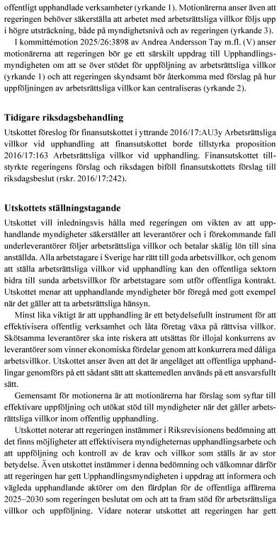 Utskottet välkomnar regeringens arbete för att det ska ställas arbetsrättsliga krav och göras uppföljningar i offentliga upphandlingar. Exempelvis förstärks upphandlingsstödet hos Upphandlingsmyndigheten. Genom digitalisering kommer det att bli lättare att ta ett helhetsgrepp på inköpsprocesserna och koppla ihop upphandling, beställning och fakturering på ett mer sammanhängande och effektivt sätt. I Färdplan för de offentliga affärerna 2025–2030 har det tillkommit ett mål om att upphandlande aktörer ska säkerställa att endast seriösa leverantörer tilldelas offentliga kontrakt och att leverantörerna ska följa avtal och gällande regelverk och ha seriösa underleverantörer. För att arbeta med detta inriktningsmål är riskanalyser, arbetsrättsliga villkor och uppföljning en självklar del. Upphandlingsmyndigheten ska också informera, vägleda och möjliggöra erfarenhetsutbyte för upphandlande aktörer om hur färdplanen kan förverkligas.