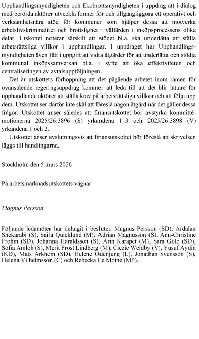 Arbetsmarknadsutskottet instämmer, liksom regeringen i Riksrevisionens bedömning att det finns möjligheter att effektivisera myndigheternas upphandlingsarbete och att uppföljning och kontroll av de krav och villkor som ställs är av stor betydelse. Utskottet välkomnar därför att regeringen har gett Upphandlingsmyndigheten i uppdrag att informera och vägleda upphandlande aktörer om den färdplan för de offentliga affärerna 2025–2030 som regeringen beslutat om och att ta fram stöd för arbetsrättsliga villkor och uppföljning. Vidare noterar utskottet att regeringen har gett Upphandlingsmyndigheten och Ekobrottsmyndigheten i uppdrag att i dialog med berörda aktörer utveckla former för och tillgängliggöra ett operativt och verksamhetsnära stöd för kommuner som hjälper dessa att motverka arbetslivskriminalitet och brottslighet i välfärden i inköpsprocessens olika delar. Utskottet noterar särskilt att stödet bl.a. ska underlätta att ställa arbetsrättsliga villkor i upphandlingar. I uppdraget har Upphandlingsmyndigheten även fått i uppgift att vidta åtgärder för att underlätta och stödja kommunal inköpssamverkan bl.a. för att öka effektiviteten och centraliseringen av avtalsuppföljningen.