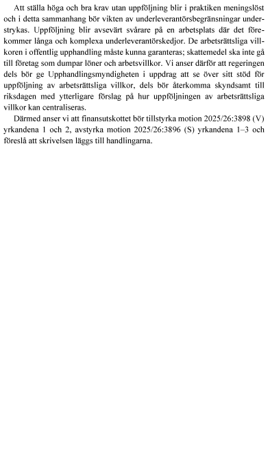 Alltför ofta är lägsta pris vägledande. Det leder enligt min mening till att oseriösa företag vinner upphandlingar genom att hålla priserna nere på bekostnad av en god arbetsmiljö och rimliga arbetsvillkor. På senare tid har även kriminella gäng etablerat sig i välfärden efter att ha vunnit upphandlingar. Utvecklingen är systemhotande och måste stoppas. Jag anser att det ska råda ordning och reda vid offentlig upphandling. Arbetstagare som arbetar inom offentligt finansierade verksamheter som upphandlas ska garanteras sjysta löner och villkor. Att ställa höga och bra krav utan uppföljning blir i praktiken meningslöst. I detta sammanhang bör vikten av underleverantörsbegränsningar understrykas. Uppföljning blir avsevärt svårare på en arbetsplats där det förekommer långa och komplexa underleverantörskedjor. De arbetsrättsliga villkoren i offentlig upphandling måste kunna garanteras; skattemedel ska inte gå till företag som dumpar löner och arbetsvillkor. Jag anser därför att regeringen bör ge ett särskilt uppdrag till Upphandlingsmyndigheten att se över sitt stöd för uppföljning av arbetsrättsliga villkor. Regeringen bör också skyndsamt återkomma till riksdagen med ytterligare förslag på hur uppföljningen av arbetsrättsliga villkor kan centraliseras.
