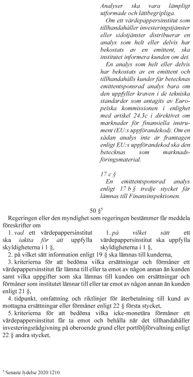 En emittentsponsrad analys åtföljd av metadata ska få lämnas till Finansinspektionen i syfte att tillgängliggöra den i den europeiska gemensamma åtkomstpunkten. Regeringen eller den myndighet regeringen bestämmer ska få meddela föreskrifter om sådan information.