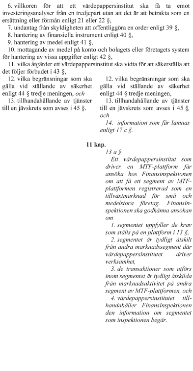 Ett värdepappersinstitut som driver en MTF-plattform ska få ansöka hos Finansinspektionen om att få ett segment av MTF-plattformen registrerad som en tillväxtmarknad för små och medelstora företag.