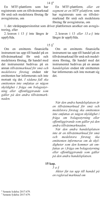 Utskottet ställer sig bakom regeringens förslag till lagändringar som är nödvändiga på grund av ändringar i EU:s direktiv om marknader för finansiella instrument, EU:s marknadsmissbruksförordning och EU:s prospektförordning. I lagen om värdepappersmarknaden föreslås bl.a. en ny möjlighet att registrera ett segment av multilaterala handelsplattformar som tillväxtmarknader för små och medelstora företag och en utökad rätt att invända mot sekundär notering av redan noterade värdepapper.