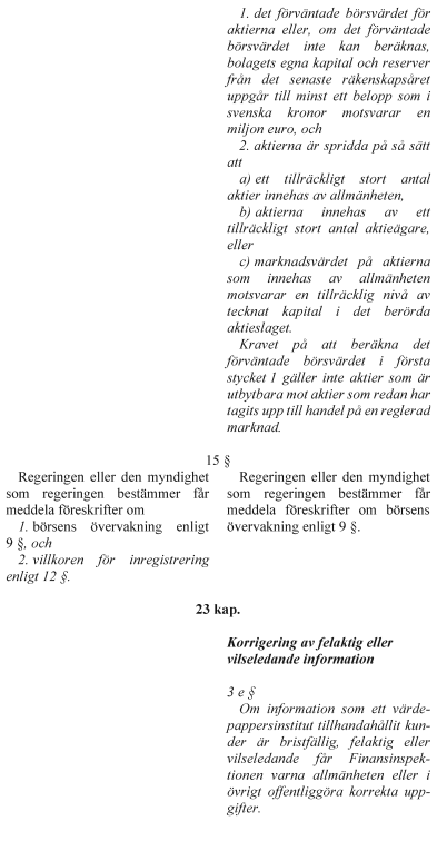 Aktier ska få tas upp till handel på en reglerad marknad om det förväntade börsvärdet för aktierna uppgår till minst ett belopp som i svenska kronor motsvarar 1 miljon euro. Om det förväntade börsvärdet för aktierna inte kan beräknas ska bolagets egna kapital och reserver från det senaste räkenskapsåret uppgå till minst ett belopp som i svenska kronor motsvarar 1 miljon euro. Dessutom ska det ställas ett krav på att aktierna har en viss spridning.
