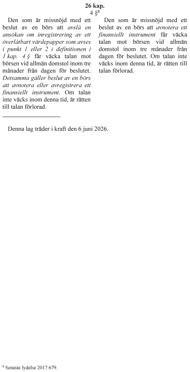 Ändringarna i lagen om värdepappersmarknaden ska träda i kraft den 6 juni 2026.