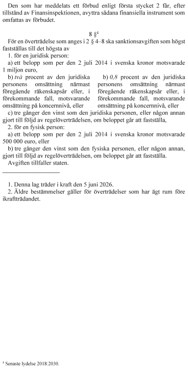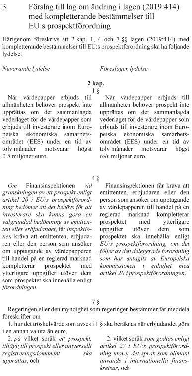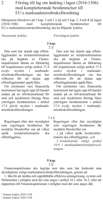 I lagen med kompletterande bestämmelser till EU:s marknadsmissbruksförordning föreslås bl.a. ändringar av beräkningen av administrativa sanktionsavgifter. Regeringen föreslår även ändringar i lagen med kompletterande bestämmelser till EU:s prospektförordning som innebär att tröskelvärdet för prospektskyldighet höjs från 2,5 miljoner euro till 12 miljoner euro och att emittenter som har Sverige som hemmedlemsstat och tar upp värdepapper till handel på en reglerad marknad i Sverige eller lämnar erbjudanden till allmänheten i Sverige ska få välja att upprätta ett prospekt antingen på svenska eller på engelska.