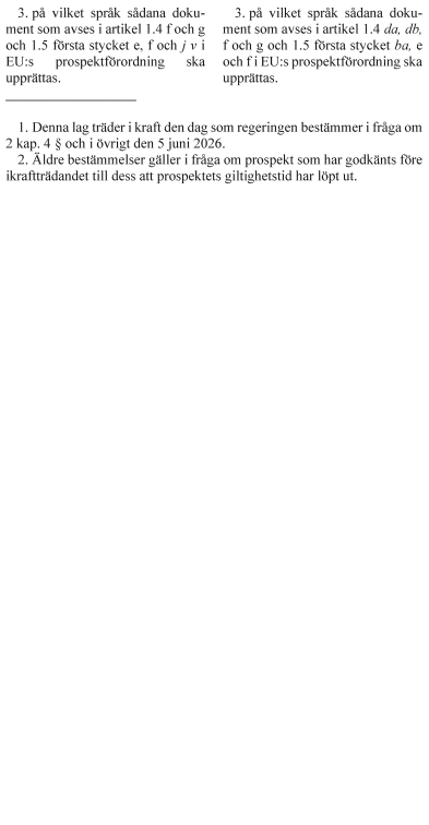 Ändringarna i lagen med kompletterande bestämmelser till EU:s förordning om referensvärden, i lagen med kompletterande bestämmelser till EU:s marknadsmissbruksförordning och i lagen med kompletterande bestämmelser till EU:s prospektförordning ska träda i kraft den 5 juni 2026.