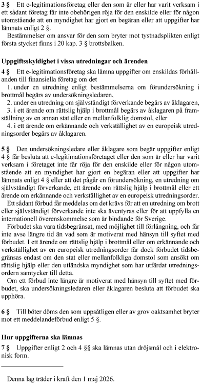 Regeringen föreslår en lagstadgad uppgiftsskyldighet för vissa e-legitimationsföretag så att brottsbekämpande myndigheter kan begära uppgifter om enskildas användning av e-legitimation i relation till finansiella företag.