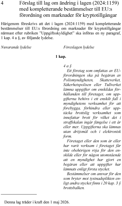 Regeringen föreslår att företag som omfattas av EU:s förordning om marknader för kryptotillgångar ska vara uppgiftsskyldiga i de brottsbekämpande myndigheternas verksamhet för att förebygga, förhindra eller upptäcka brottslig verksamhet och att meddelandeförbud (i vissa utredningsskeden) ska kunna användas. En bestämmelse om uppgiftsskyldighet i underrättelseverksamhet ska enligt förslaget införas i lagen med kompletterande bestämmelser till EU:s förordning om marknader för kryptotillgångar. Bestämmelsen ska enligt förslaget utformas på samma sätt och med samma begränsningar som motsvarande bestämmelser för andra finansiella företag. D.v.s. att ett företag som omfattas av EU-förordningen om kryptotillgångar på begäran av Polismyndigheten, Skatteverket, Säkerhetspolisen eller Tullverket ska lämna uppgifter om enskildas förhållanden till ett e-legitimationsföretag.