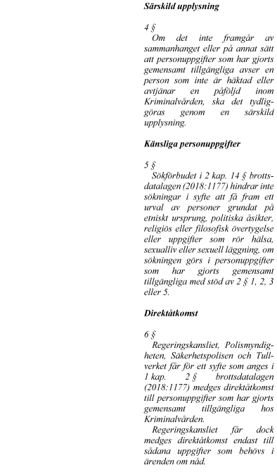 Förslaget innebär bl.a. att de uppgifter om Kriminalvårdens klienter som ska få göras gemensamt tillgängliga ska avgränsas till uppgifter om vissa kategorier av personer, t.ex. uppgifter om frihetsberövade eller om personer som är dömda till en påföljd som ska verkställas inom Kriminalvården. Det föreslås även att uppgifter om andra personer än klienter ska få göras gemensamt tillgängliga, t.ex. närstående och andra som har nära förbindelse med en registrerad och målsägande. Om det inte framgår av sammanhanget eller på annat sätt att personuppgifter som har gjorts gemensamt tillgängliga avser en person som varken är häktad eller avtjänar en påföljd inom Kriminalvården, ska det tydliggöras genom en särskild upplysning. För att göra det möjligt för Kriminalvården att i vissa fall använda känsliga personuppgifter vid sökning i gemensamt tillgängliga uppgifter, föreslås också ett undantag från sökförbudet i brottsdatalagen (2 kap. 14 § brottsdatalagen).
