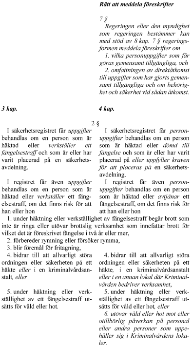 Det centrala kriminalvårdsregistret innehåller en stor mängd uppgifter som Kriminalvården behöver för att kunna utföra sitt uppdrag. Det är bl.a. uppgifter om personer som avtjänar en påföljd inom myndigheten. Behandlingen av personuppgifter i det centrala kriminalvårdsregistret regleras i huvudsak i kriminalvårdens brottsdataförordning. Förordningen innehåller bl.a. en detaljerad och uttömmande uppräkning av vilka uppgifter registret får innehålla.