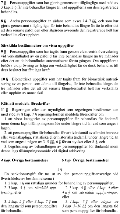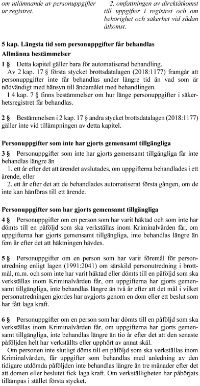 Olika tidsfrister för behandling föreslås gälla vid olika typer av personuppgifter. När det gäller personuppgifter som har gjorts gemensamt tillgängliga ska t.ex. uppgifter om en person som har varit häktad och som inte har dömts till en påföljd inte få behandlas under längre tid än fem år efter det att häktningen hävdes, medan uppgifter om en person som har dömts till en påföljd som ska verkställas inom Kriminalvården inte ska få behandlas under längre tid än tio år efter det att den senaste påföljden helt har verkställts eller upphört av annat skäl. Ytterligare tidsfrister föreslås gälla för andra uppgiftskategorier. Det föreslås t.ex. att biometriska uppgifter som har tagits fram för ansiktsigenkänning av en person som har dömts till fängelse som längst ska få behandlas under tre månader efter det att det senaste fängelsestraffet helt har verkställts eller upphört av annat skäl.