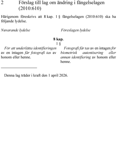 Regeringen föreslår att det ska klargöras att Kriminalvården får ta fotografi av den som avtjänar fängelsestraff för biometrisk autentisering eller annan identifiering av honom eller henne. Kriminalvården ska även få motsvarande möjlighet att ta fotografi av den som avtjänar ett fängelsestraff med elektronisk övervakning.