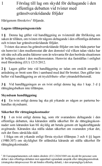 1. lag om skydd för deltagande i den offentliga debatten vid tvister med gränsöverskridande följder,