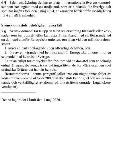 Riksdagen antar regeringens förslag till en ny lag om skydd för deltagande i den offentliga debatten vid tvister med gränsöverskridande följder. Förslaget genomför Europaparlamentets och rådets direktiv (EU) 2024/1069 om skydd för personer som deltar i den offentliga debatten mot uppenbart ogrundade anspråk eller rättegångsmissbruk (strategiska rättsprocesser för att hindra offentlig debatt). Riksdagen antar även regeringens förslag till lagändringar om en ny tredskodomssanktion som innebär att en domstol i vissa fall får meddela en tredskodom mot en part som inte har svarat på förelägganden från rätten.