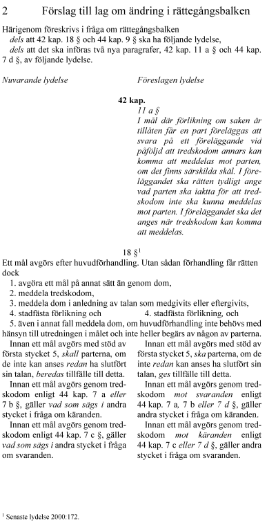 Utskottet ställer sig vidare bakom regeringens förslag till lagändringar om en ny tredskodomssanktion som innebär att en domstol i vissa fall får meddela en tredskodom mot en part som inte har svarat på förelägganden från rätten. Förslaget bidrar till en effektivare handläggning av tvistemål.