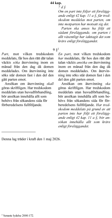 Slutligen föreslår regeringen att om en tredskodom har meddelats på grund av att en part inte har följt ett föreläggande enligt 42 kap. 11 a § rättegångsbalken, ska kravet på vad ansökan om återvinning ska innehålla vara att den bör innehålla allt som krävs enligt föreläggandet. En tredskodom som har meddelats enligt 44 kap. 7 d § rättegångsbalken ska få verkställas genast, om inte något annat beslutas med anledning av ansökan om återvinning.