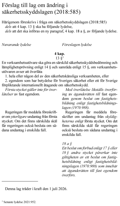 Genom de föreslagna lagändringarna kommer överlåtelser av fast egendom att omfattas av säkerhetsskyddslagens regler om överlåtelse. Det innebär att den som bedriver säkerhetskänslig verksamhet och som vill överlåta fast egendom av betydelse för Sveriges säkerhet måste göra en särskild säkerhetsskyddsbedömning och lämplighetsprövning samt samråda med tillsynsmyndigheten innan överlåtelsen. Det innebär också att tillsynsmyndigheten kan förbjuda olämpliga överlåtelser. Även sådan överföring av äganderätt till fast egendom som sker genom fastighetsbildning omfattas av den aktuella regleringen.