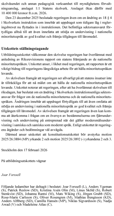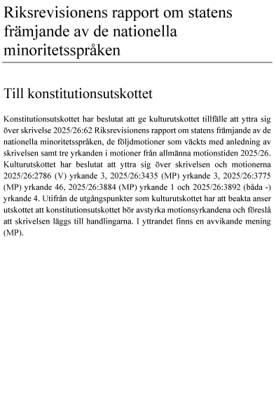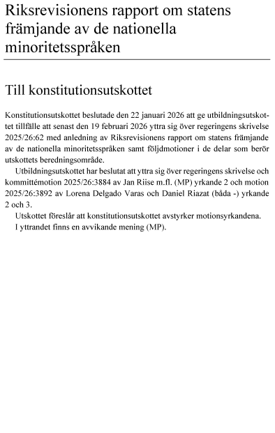 I betänkandet behandlar utskottet regeringens skrivelse 2025/26:62 Riksrevisionens rapport om statens främjande av de nationella minoritetsspråken och tio yrkanden i följdmotioner samt tre yrkanden i motioner från allmänna motionstiden 2025/26.