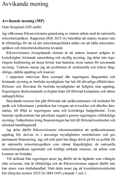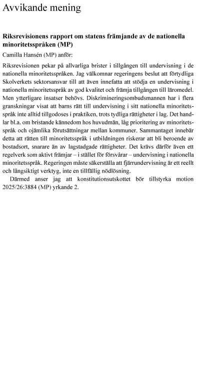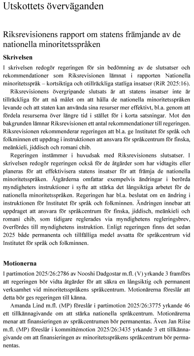 I skrivelsen redovisar regeringen sin bedömning av de slutsatser och rekommendationer Riksrevisionen lämnar i granskningsrapporten Nationella minoritetsspråk – kortsiktiga och otillräckliga statliga insatser (RiR 2025:16). Regeringen redogör även för åtgärder som har vidtagits och planeras för att effektivisera statens insatser. Riksdagen överlämnade Riksrevisionens rapport till regeringen den 3 juni 2025. Riksrevisor Christina Gellerbrant Hagberg med medarbetare presenterade granskningsrapporten vid konstitutionsutskottets sammanträde den 10 juni 2025.