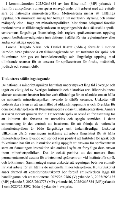 I motion 2025/26:3892 av Lorena Delgado Varas och Daniel Riazat (båda ‑) yrkande 4 föreslås ett tillkännagivande om att Institutet för språk och folkminnen ska ges ett instruktionsenligt och långsiktigt uppdrag att ansvara för språkcentrum för finska, meänkieli, jiddisch och romani chib, med tillhörande resurser.
