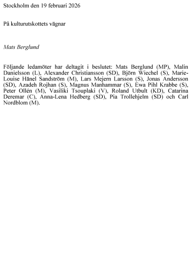 Konstitutionsutskottet har gett kulturutskottet och utbildningsutskottet tillfälle att yttra sig över skrivelsen, följdmotionerna och tre yrkanden i motioner från allmänna motionstiden 2025/26, i de delar som berör respektive utskotts beredningsområde. Båda utskotten har yttrat sig, se bilaga 2 och 3.