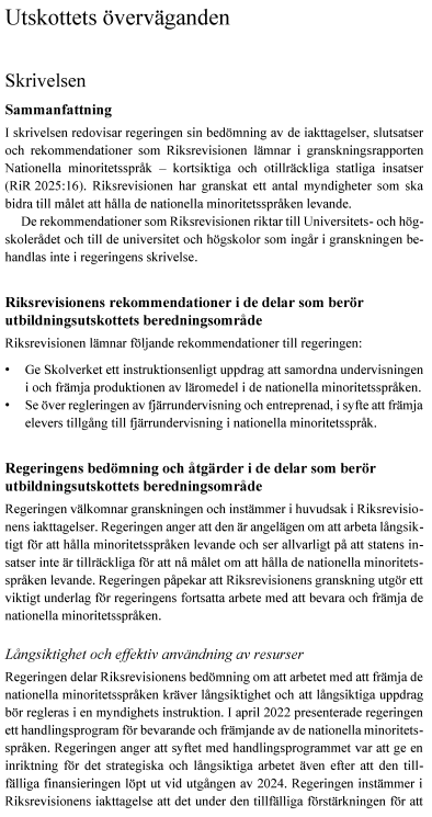 I skrivelsen redovisar regeringen sin bedömning av de slutsatser och rekommendationer Riksrevisionen lämnar i granskningsrapporten Nationella minoritetsspråk – kortsiktiga och otillräckliga statliga insatser (RiR 2025:16). Regeringen redogör även för åtgärder som har vidtagits och planeras för att effektivisera statens insatser för att främja de nationella minoritetsspråken.