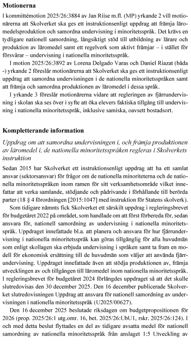 I kommittémotion 2025/26:3884 av Jan Riise m.fl. (MP) yrkande 2 föreslås ett tillkännagivande om att ge Skolverket ett instruktionsenligt uppdrag att främja läromedelsproduktion och samordna undervisning i minoritetsspråk.