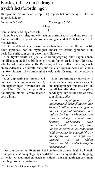 I propositionen föreslås att en upptagning för automatiserad behandling som har kommit in till en myndighet genom att en informationsbärare har tagits i beslag i verksamhet som avser utredning av brott eller brottslig verksamhet eller internationell rättslig hjälp, eller kopierats vid en husrannsakan i sådan verksamhet, inte ska anses vara en allmän handling. Detsamma gäller en upptagning som har kommit in till en myndighet till följd av att myndigheten har tagit över ansvaret för den beslagtagna informationsbäraren eller kopian från husrannsakan. Om en upptagning tillförs en utredning av brott eller brottslig verksamhet eller annan verksamhet hos myndigheten ska den dock även fortsättningsvis utgöra en allmän handling. Ändringen föreslås införas genom ett tillägg i 2 kap. 14 § tryckfrihetsförordningen.