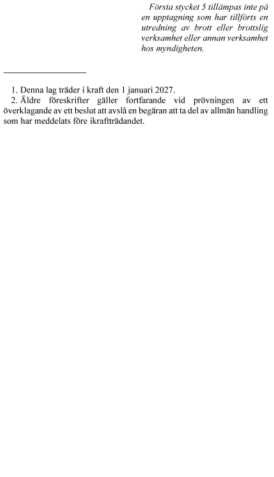Regeringen anser dock att det vore en otillfredsställande ordning att ändra en handlings rättsliga status under pågående handläggning av mål i domstol som rör prövning av ett beslut att avslå en begäran att med stöd av 2 kap. tryckfrihetsförordningen ta del av en sådan upptagning. Regeringen föreslår därför en övergångsbestämmelse som innebär att äldre föreskrifter fortfarande ska gälla vid prövningen av ett överklagande av ett beslut att avslå en begäran att ta del av allmän handling som har meddelats före ikraftträdandet. Det innebär att en domstol kommer att behöva förhålla sig till samma föreskrifter som beslutsmyndigheten vid prövningen av ett överklagande som gäller ett sådant beslut.