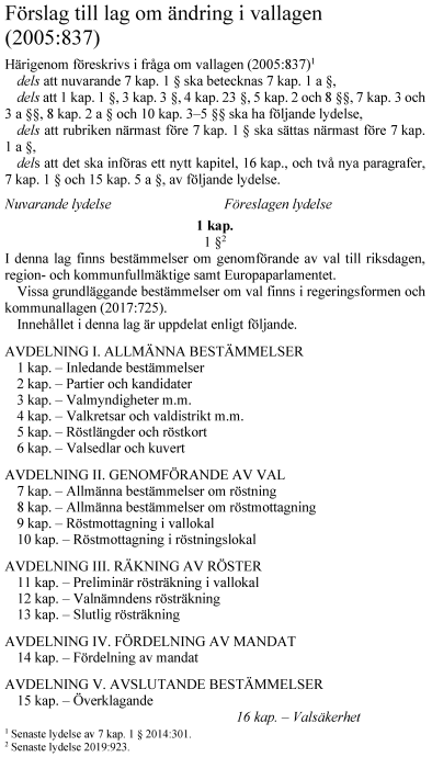 Riksdagen antar regeringens förslag till lag om ändring i vallagen (2005:837).