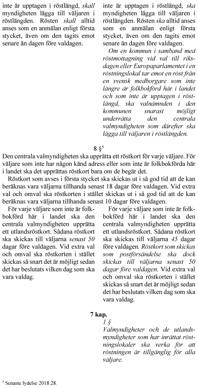 I Valmyndighetens erfarenhetsrapporter från de allmänna valen 2018 framgår att tryckning och distribution av röstkort är kritiska moment som utförs under förhållandevis knappa tidsramar. Utdelningen av reguljär post tar väsentligen längre tid än en digital försändelse. Detta påverkar möjligheten för både väljare som är folkbokförda i Sverige och för utlandssvenskar att få sina röstkort i tid till att förtidsröstningen inleds. Enligt Valmyndigheten når dessutom många röstkort inte den avsedda adressaten. Regeringen bedömer att det bör införas en möjlighet att skicka röstkort digitalt till väljare. En reglering för att skapa förutsättningar för det kräver inte någon ändring i lag utan kan tas i förordning.