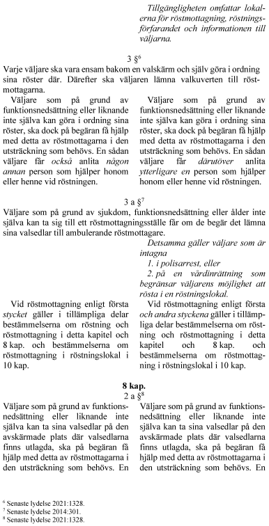 Enligt 7 kap. 3 § andra stycket vallagen ska väljare som på grund av funktionsnedsättning eller liknande inte själva kan göra i ordning sina röster på begäran få hjälp med detta av röstmottagarna i den utsträckning som behövs. En sådan väljare får också anlita någon annan person som hjälper honom eller henne vid röstningen.