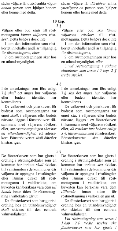 Det ställs också krav på att en röstmottagare alltid ska vara närvarande när väljare anlitar ett biträde. Utlandssvenskar som fallit ur röstlängden ska kunna rösta i Sverige och genom sin förtidsröst återupptas i röstlängden.