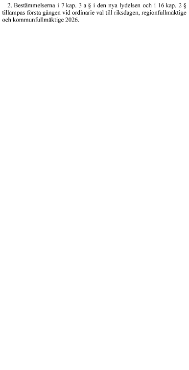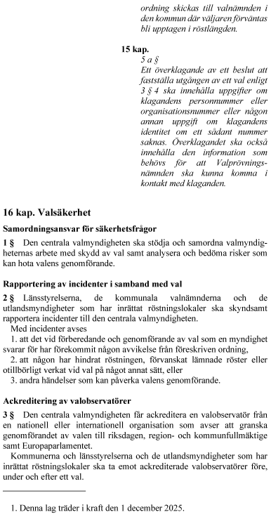 Lagändringarna föreslås träda i kraft den 1 december 2025. Skyldigheten för de kommunala valnämnderna, länsstyrelserna och de utlandsmyndigheter som har inrättat röstningslokaler att skyndsamt rapportera incidenter och utvidgningen av målgruppen för ambulerande röstmottagare ska tillämpas första gången inför och vid ordinarie val till riksdagen, regionfullmäktige och kommunfullmäktige 2026.