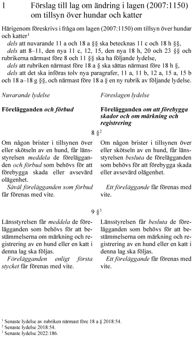 1. lag om ändring i lagen (2007:1150) om tillsyn över hundar och katter,