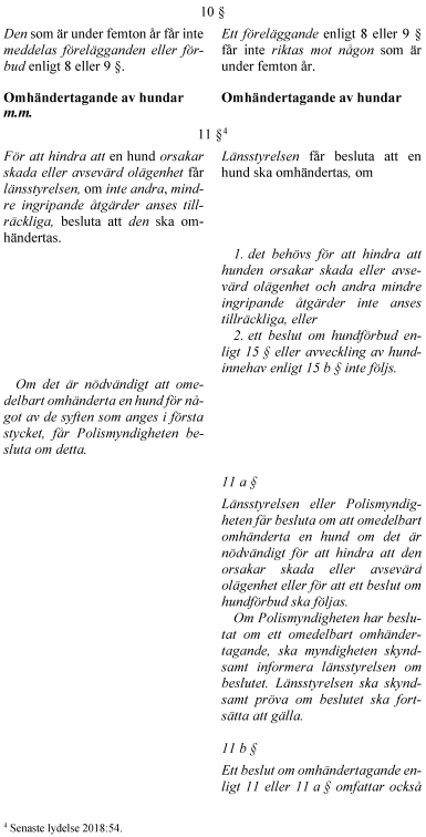 Regeringen föreslår vidare att länsstyrelsen ska få besluta att en hund ska omhändertas om ett beslut om hundförbud eller beslut om avveckling av hundinnehav inte följs. Såväl länsstyrelsen som Polismyndigheten ska även få besluta om omedelbara omhändertaganden om det är nödvändigt för att ett beslut om hundförbud ska följas.