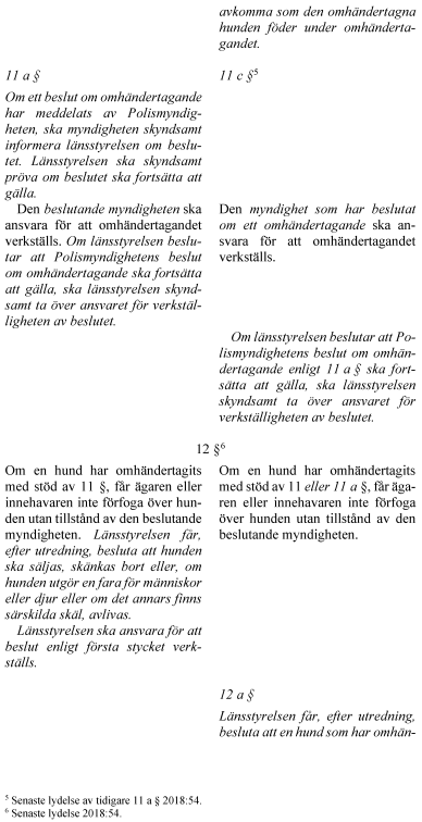 Länsstyrelsen ska också, enligt regeringens förslag, i övrigt få besluta om omedelbara omhändertaganden enligt tillsynslagen. Ett beslut om omhändertagande eller omedelbart omhändertagande av en hund ska också omfatta avkomma som den omhändertagna hunden föder under omhändertagandet. Om det inte går att verkställa ett beslut om att en omhändertagen hund ska säljas eller överlåtas, ska länsstyrelsen i stället få besluta att hunden ska avlivas.