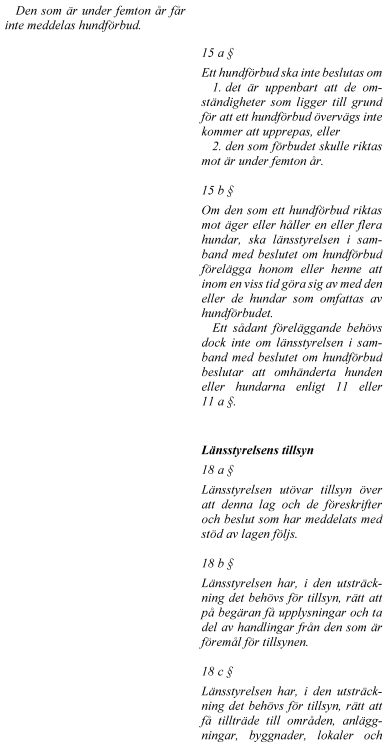 I svensk rätt finns det i övrigt inte någon reglering som förbjuder specifika hundraser eller som kräver tillstånd för kamphundsraser. Av förarbetena (prop. 2006/07:126 s. 18) till tillsynslagen framgår det bl.a. att det i debatten om farliga hundar ofta har framförts att vissa raser är farligare än andra och att dessa därför bör förbjudas. Regeringen ansåg dock att den huvudsakliga gemensamma nämnaren som går att finna mellan farliga hundar är att de har ägare som brister i sitt hundägaransvar. I samma förarbeten diskuterades även införande av ett s.k. hundkörkort. Ett hundkörkort skulle kunna utfärdas till den som har genomgått utbildning om t.ex. hundens beteenden och behov, dressyr eller samhällets krav på hundägande. Ett alternativ vore att en hundägare måste visa att han eller hon klarar av att kontrollera den egna hunden för att få ett hundkörkort. Regeringen bedömde dock att ett sådant tillstånd inte borde införas eftersom det vore en alltför ingripande åtgärd mot den överväldigande majoritet av hundägare som sköter sina hundar på ett bra sätt.