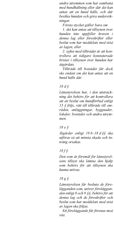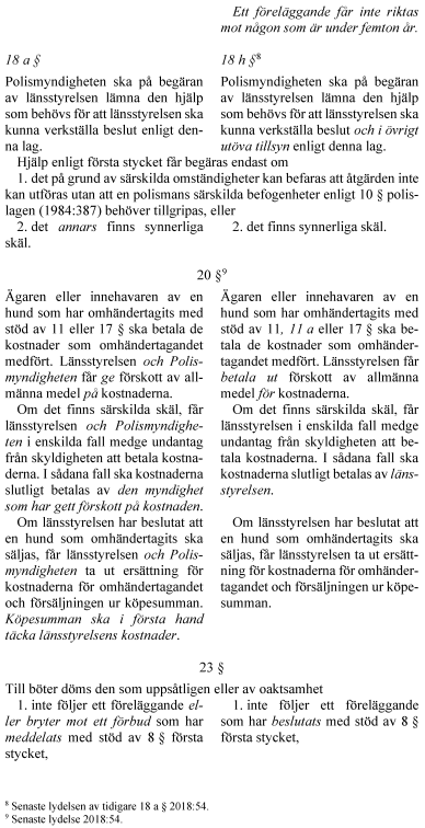 I propositionen föreslår regeringen ändringar i lagen (2007:1150) om tillsyn över hundar och katter (tillsynslagen) och djurskyddslagen (2018:1192) som syftar till att effektivisera arbetet enligt de båda lagarna. Ändringarna gäller bl.a. möjlighet för länsstyrelserna att utöva tillsyn enligt tillsynslagen, få tillträde till bostäder och andra utrymmen för tillsynen och besluta om omedelbara omhändertaganden i större utsträckning. Regeringen föreslår också en möjlighet för Polismyndigheten att besluta om avlivning av djur som omhändertagits enligt djurskyddslagen i vissa fall.