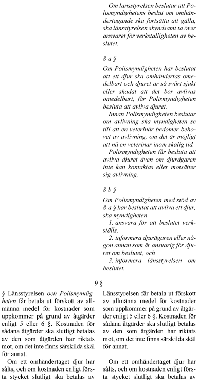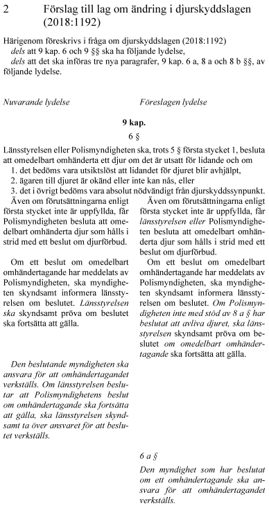 Regeringens lagförslag innebär bl.a. möjlighet för länsstyrelserna att utöva tillsyn enligt tillsynslagen, få tillträde till bostäder och andra utrymmen för tillsynen och besluta om omedelbara omhändertaganden i större utsträckning. Det föreslås också en möjlighet för Polismyndigheten att besluta om avlivning av djur som omhändertagits enligt djurskyddslagen i vissa fall.