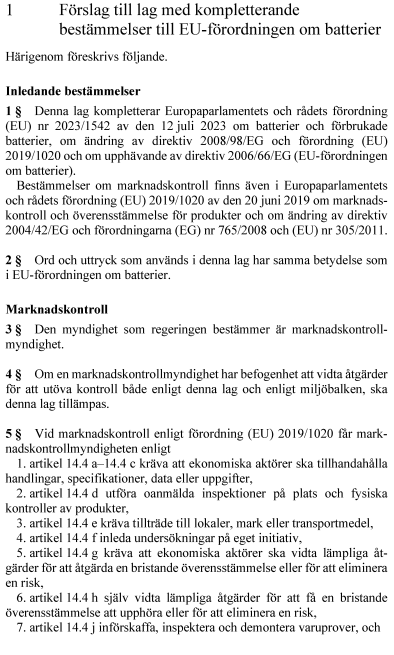 1. lag med kompletterande bestämmelser till EU-förordningen om batterier,