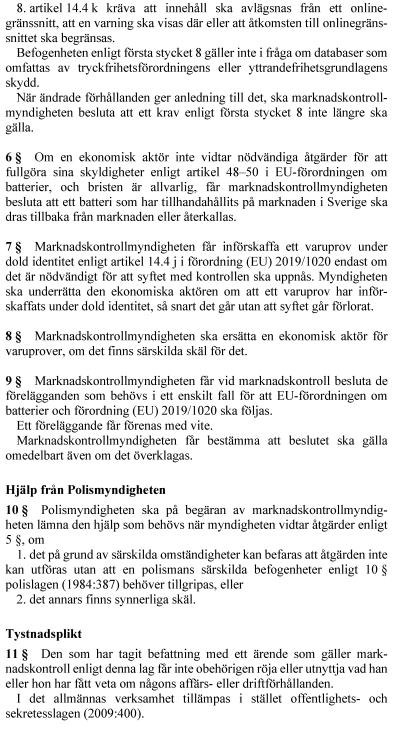 [1] Europaparlamentets och rådets förordning (EU) 2019/1020 om marknadskontroll och överensstämmelse för produkter och om ändring av direktiv 2004/42/EG och förordningarna (EG) nr 765/2008 och (EU) nr 305/2011.