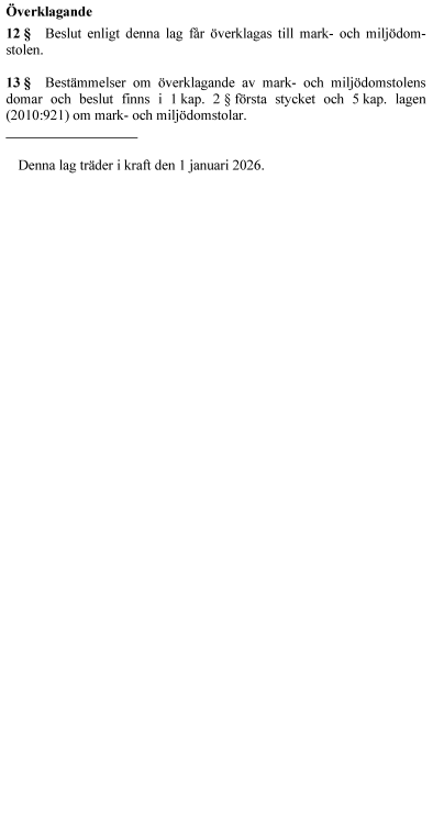 Regeringen föreslår att beslut enligt den nya lagen ska få överklagas till mark- och miljödomstolen. Det ska införas en upplysning i lagen om var det finns bestämmelser om överklagande av mark- och miljödomstolens domar och beslut.