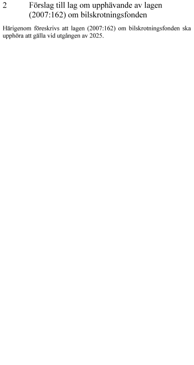 I propositionen föreslår regeringen också att lagen (2007:162) om bilskrotningsfonden upphävs.