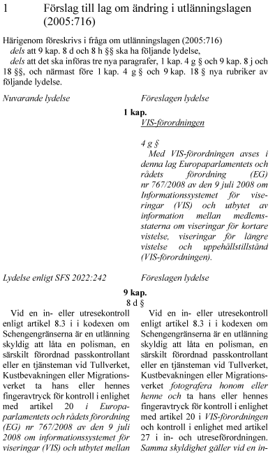 Regeringen föreslår att bestämmelser som kompletterar VIS-förordningen ska införas i utlänningslagen, utlänningsdatalagen (2016:27) och lagen (2018:1693) om polisens behandling av personuppgifter inom brottsdatalagens område. Vissa ändringar som följer av VIS-förordningen ska vidare göras i lagen (2017:496) om internationellt polisiärt samarbete. Förslagen innebär bl.a. en utökad skyldighet för en utlänning att lämna biometriska uppgifter, dvs. fingeravtryck och fotografi, vid ansökan om nationell visering (visering för längre vistelse), vid gränskontroll och inre utlänningskontroll.