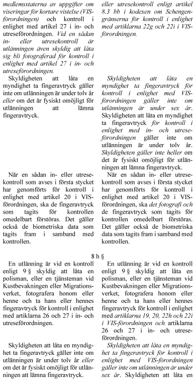 Regeringen föreslår att en utlänning vid en in- eller utresekontroll enligt artikel 8.3 bb i gränskodexen ska vara skyldig att låta en polis, en särskilt förordnad passkontrollant eller en tjänsteman vid Tullverket, Kustbevakningen eller Migrationsverket fotografera honom eller henne och ta hans eller hennes fingeravtryck för kontroll i enlighet med artiklarna 22g och 22i i VIS-förordningen.