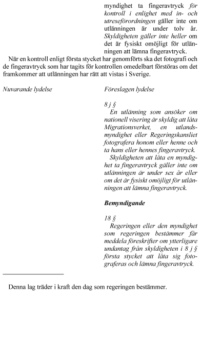 Riksdagen antar regeringens förslag till ändringar i bl.a. utlänningslagen. Förslagen innebär bl.a. en utökad skyldighet för en utlänning att lämna biometriska uppgifter, dvs. fingeravtryck och fotografi, vid ansökan om nationell visering (visering för längre vistelse), vid gränskontroller och vid inre utlänningskontroller. Därmed avslår riksdagen ett motionsyrkande om att delvis avslå propositionen.