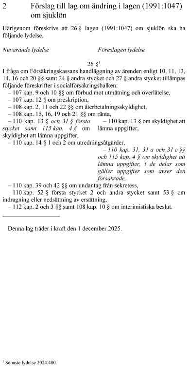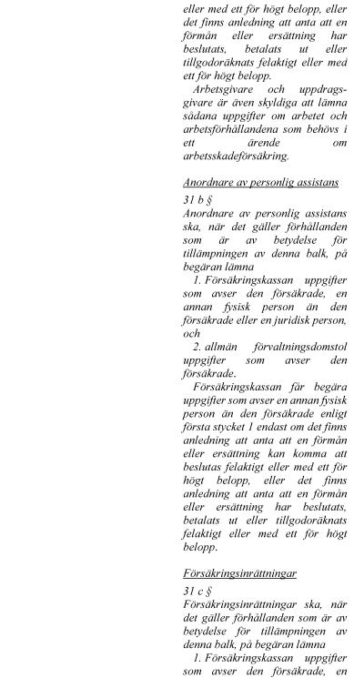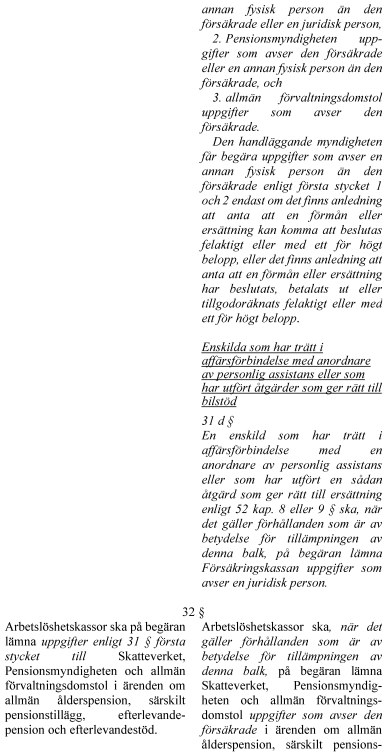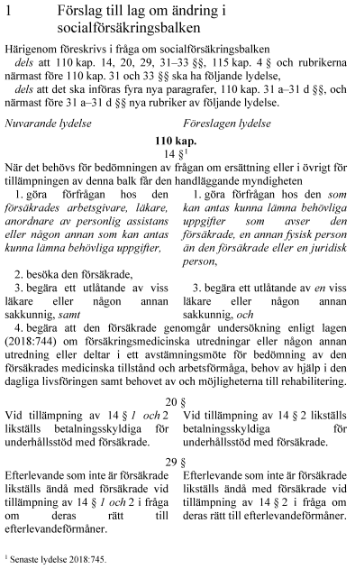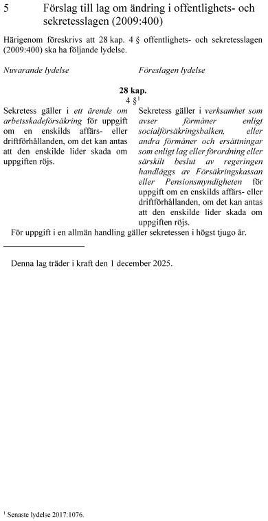 Riksdagen antar regeringens förslag till ändringar i bl.a. socialförsäkringsbalken, offentlighets- och sekretesslagen och socialtjänstlagen. Lagändringarna innebär utökade utredningsbefogenheter och uppgiftsskyldigheter som syftar till att stärka förutsättningarna för att fatta korrekta beslut och förhindra felaktiga utbetalningar. Lagändringarna innebär även att sekretesskyddet hos Försäkringskassan och Pensionsmyndigheten för uppgifter om enskildas affärs- och driftsförhållanden utökas.