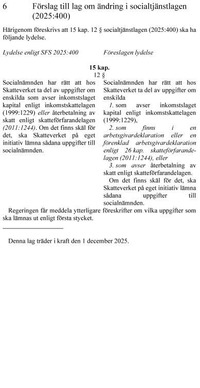 6. Riksdagen antar regeringens förslag till lag om ändring i socialtjänstlagen (2025:400).