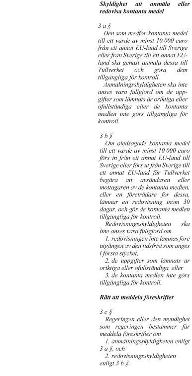 Genom lagändringarna införs en anmälnings- och redovisningsskyldighet för kontanta medel till ett värde av minst 10 000 euro som förs över gränsen mot ett annat EU-land. Vidare ges Tullverket befogenhet att vidta åtgärder för att kontrollera anmälnings- och redovisningsskyldigheten och tillfälligt kvarhålla kontanta medel för vidare kontroll.